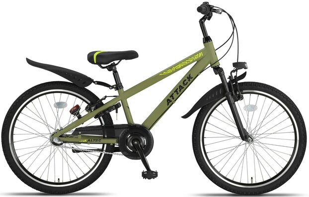 Opvallen doe je zeker met de Altec Attack. Deze multifunctionele jongensfiets kan gebruikt worden voor de dagelijkse ritjes, maar kan ook gebruikt worden om lekker te crossen. De Altec Attack heeft niet alleen een stoer uiterlijk maar ook nog eens hele handige specificaties! Het frame is vervaardigd uit staal. Dit maakt deze stoere mountainbike erg stevig. Ondanks dat deze fiets tegen een stootje kan, wil je dit natuurlijk voorkomen. Daarom beschikt deze stoere mountainbike over veilige V-brakes en terugtraprem. Geen heuvel is te steil en de langere routes zijn appeltje eitje met de Shimano Nexus 3 versnellingen. Schakel eenvoudig naar een trapzwaarte die voor jou comfortabel voelt. Ga je een middagje crossen? Geen probleem! De luxe vervende voorvork vangt de schokken goed op. Toch raden wij voor de veiligheid een extra kabel of kettingslot aan.