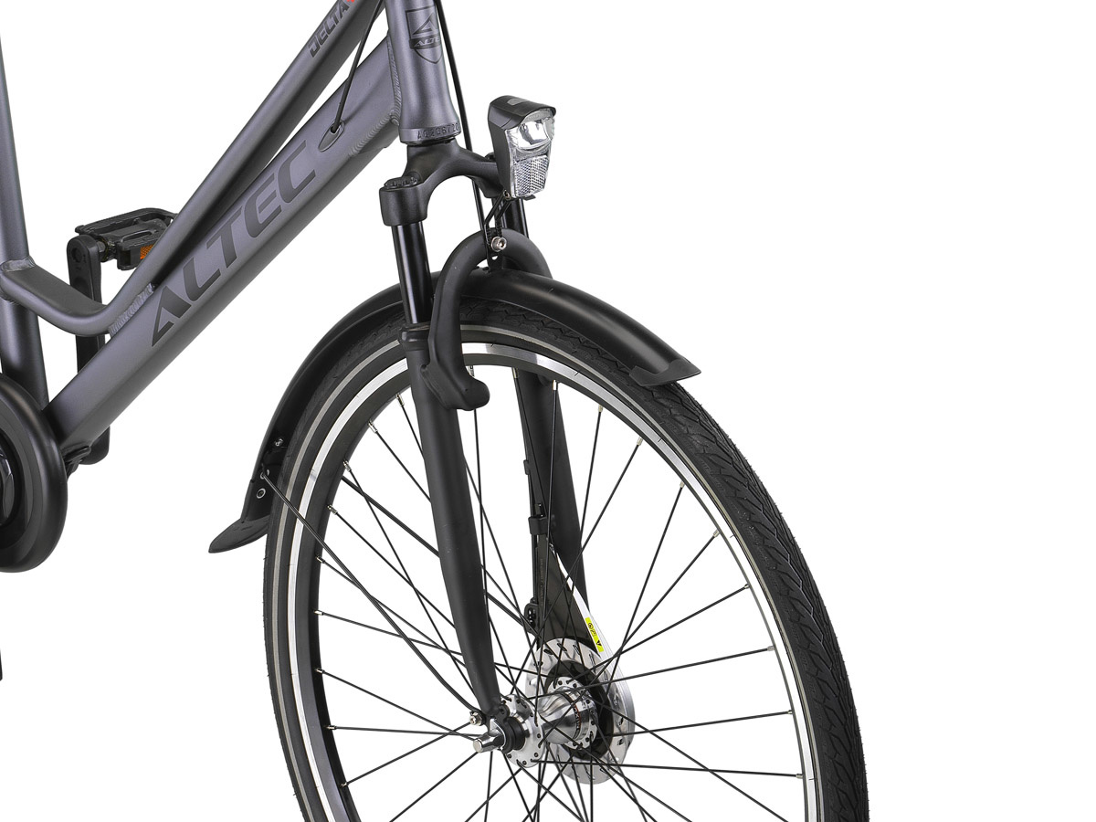 Altec Delta Damesfiets 28 inch 50cm 3v is een luxere stadsfiets die beschikt over specificaties van hogere kwaliteit. Het frame is bijvoorbeeld gemaakt van aluminium. Dit maakt de Delta niet alleen lichter qua gewicht, maar ook roestvrij. Zeer handig wanneer u de fiets nodig heeft in de regen. De langere afstanden worden eenvoudig gemaakt door de aanwezigheid van de 3 Shimano Nexus versnellingen. Naar de juiste stand schakelen maakt uw rit een stuk aangenamer en makkelijker om af te leggen. De verende voorvork vangt de meeste schokken op en maakt de rit een stuk fijner. In het donker is de verlichting te gebruiken zodat u zichtbaar en veilig bent.
