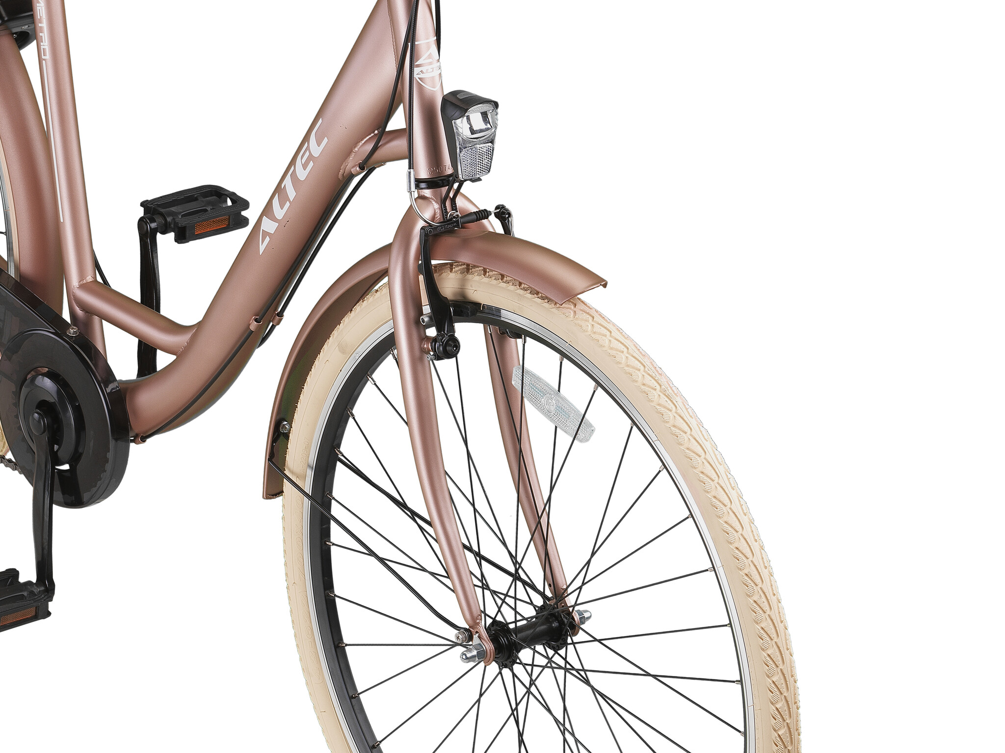 Je kunt de fiets onder controle houden door middel van de veilige V-brake handremmen. Het beste aan deze elegante stadsfiets zijn toch wel de 7 versnellingen. Hiermee zijn de snelheid en trapzwaarte van jouw fiets altijd op het niveau dat perfect is voor jou. De velgen bestaan, in tegenstelling tot het frame uit aluminium. Lichtgewicht en roestvrij dus! Voor de fanatieke fietser die ook s’ nachts gebruikt wilt maken van de Altec Metro, zit er op zowel de voor als achterkant LED verlichting.