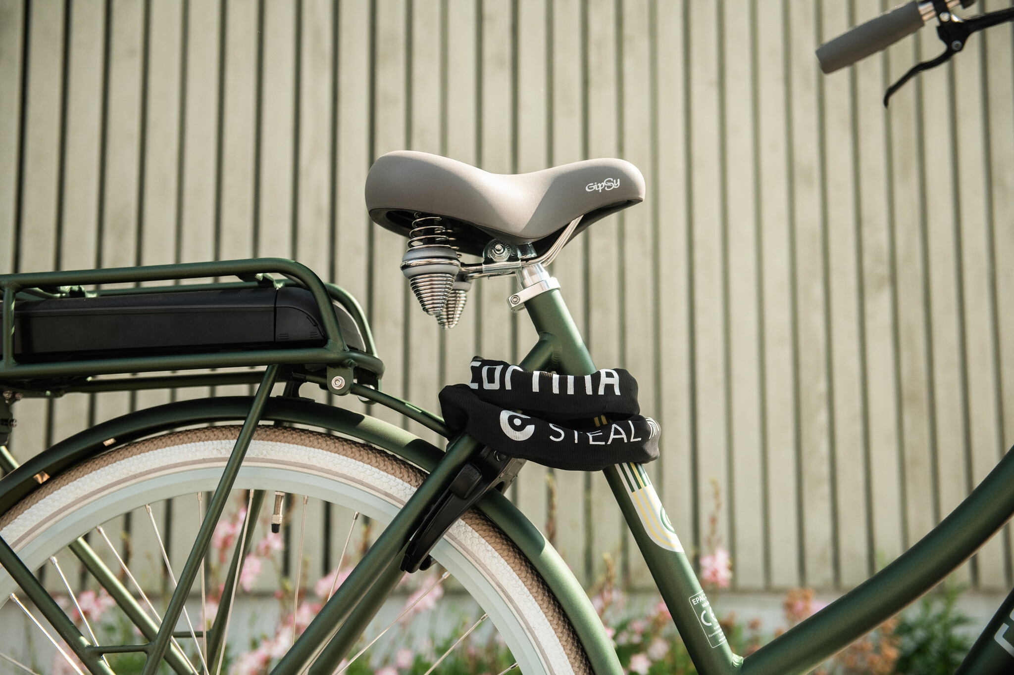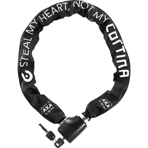 Cortina Kettingslot Barcelona Absolute 9/90 ART2. Dit AXA Absolute kettingslot met witte 'Steel My Heart, Not My Cortina' bedrukking is speciaal gemaakt om je Cortina fiets extra te beveiligen. Het is een kwalitatief hoogwaardige ketting voor langdurig parkeren. De ketting heeft een ART 2 sterren goedkeur, hiermee voldoet het slot aan de eisen om een fietsverzekering af te sluiten. Het Barcelona kettingslot is 90 cm lang, de diameter van de schakels bedraagt 9 mm en heeft een zwarte beschermhoes. Gewicht: 2,24 kg.
