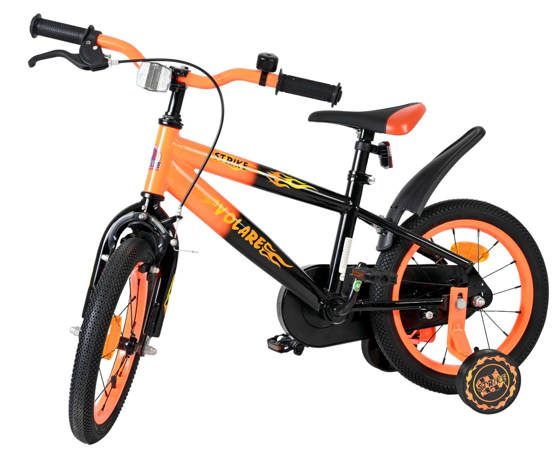 De Volare Strike 14 inch kinderfiets is een stoere fiets voor jonge racers die klaar zijn voor hun eerste grote avonturen op twee wielen. Met zijn sportieve zwart-oranje design en robuuste uitstraling is deze fiets een echte blikvanger.